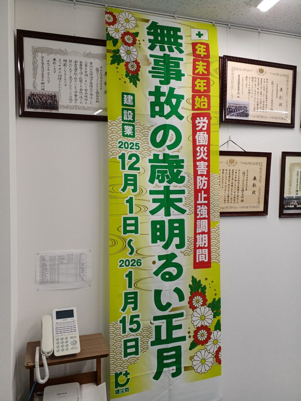 弊社では「無事故の歳末 明るい正月」のスローガンの下、のぼりやポスターの掲示等で労働災害防止活動を行っております。