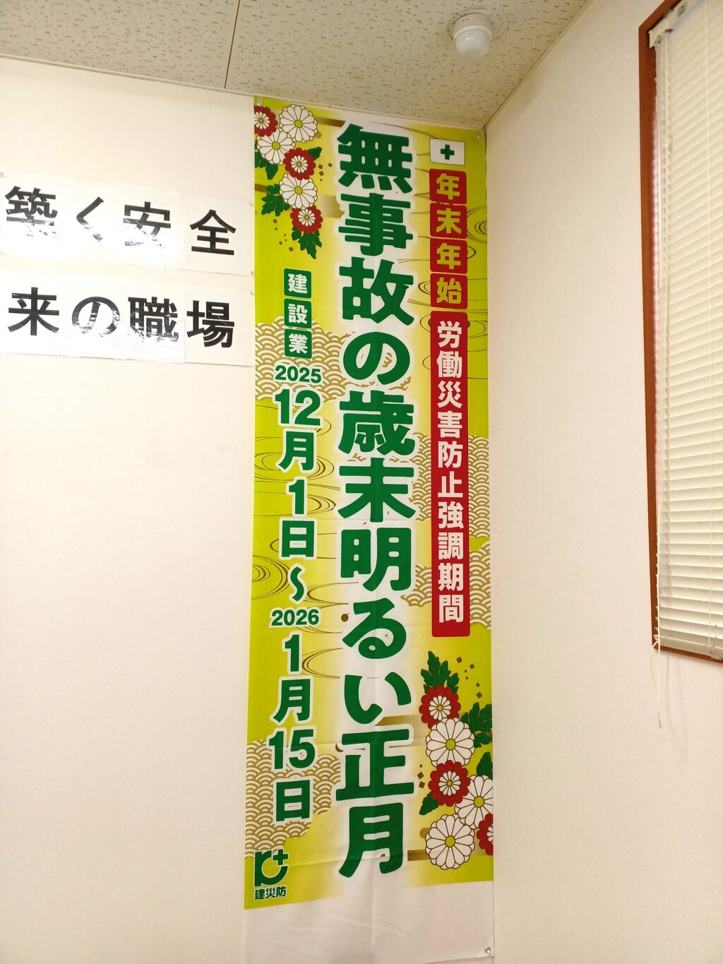 建設業労働災害防止協会では令和7年12月1日~令和8年1月15日まで、長期の休業前の慌ただしい中での気持ちの焦りや、休業後に気持ちの切換えが追い付かない中で引き起こされる不安全行動などを防止する為、建設業年末年始労働災害防止強調週間の活動を行っております。