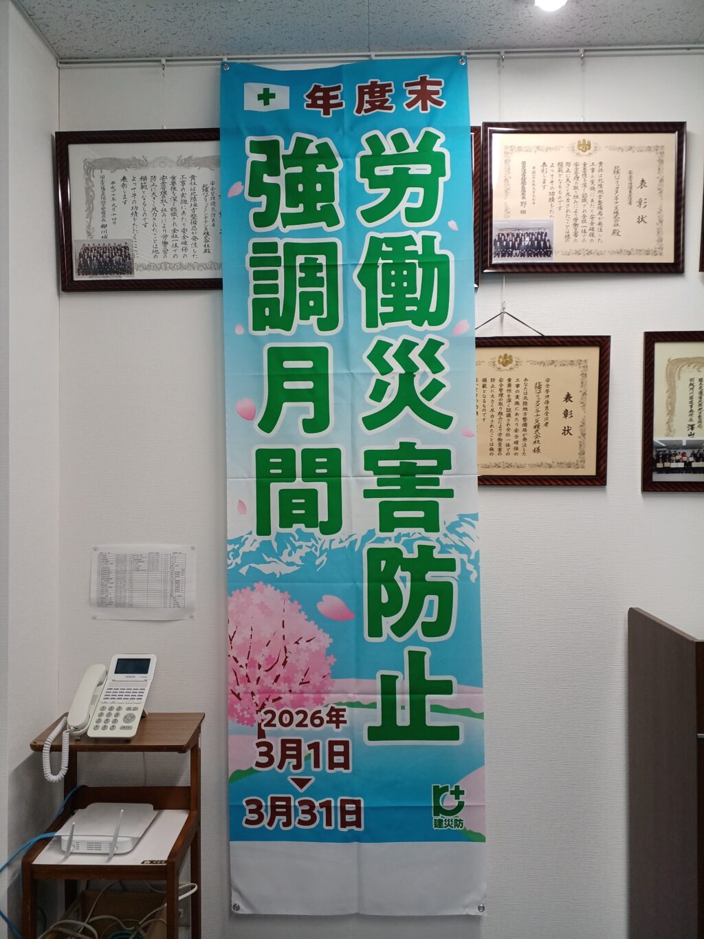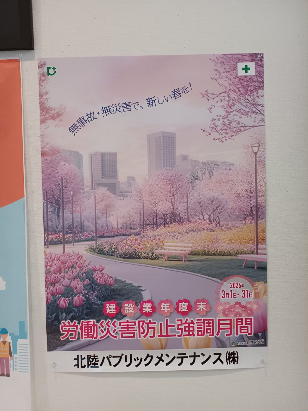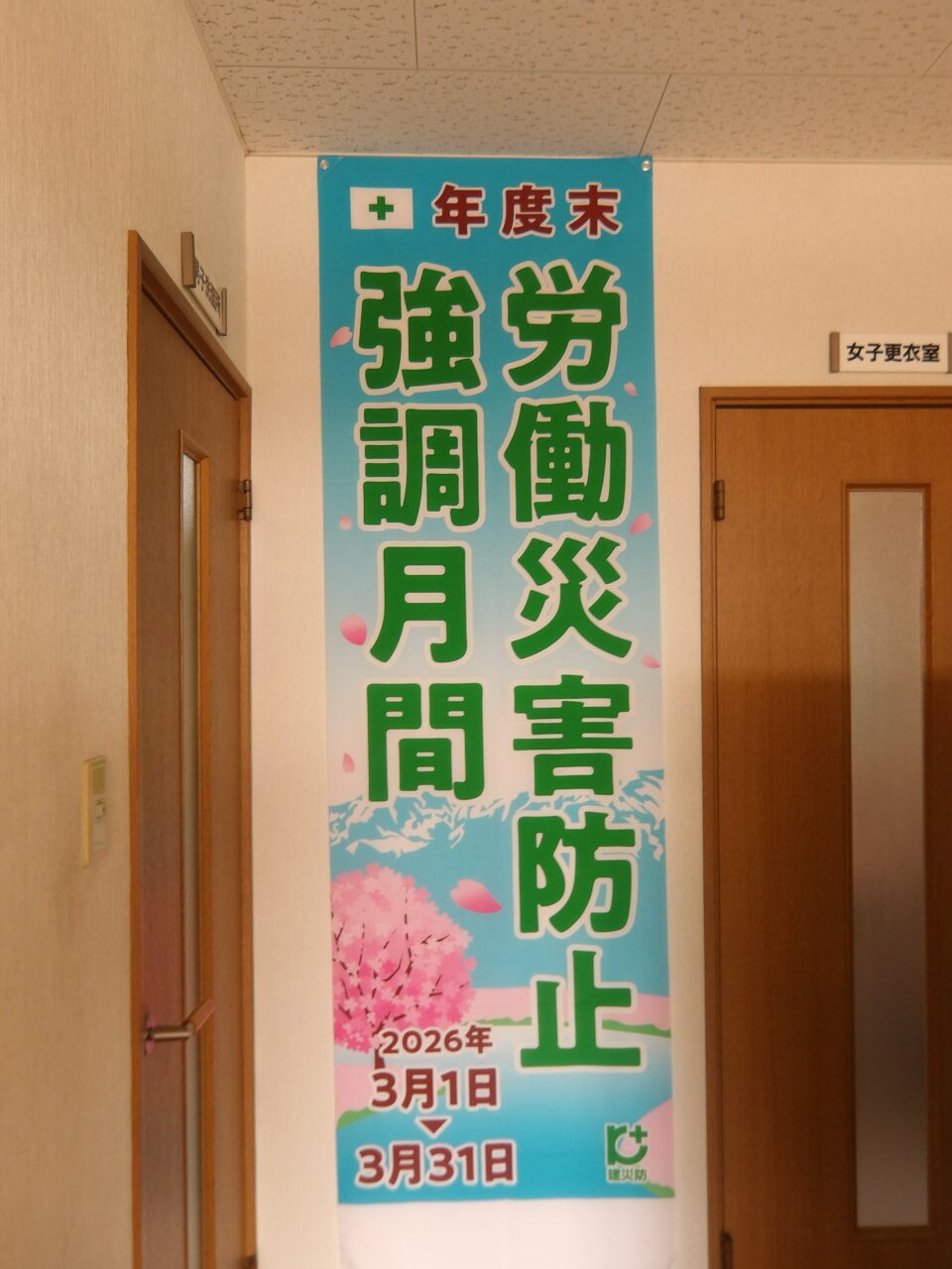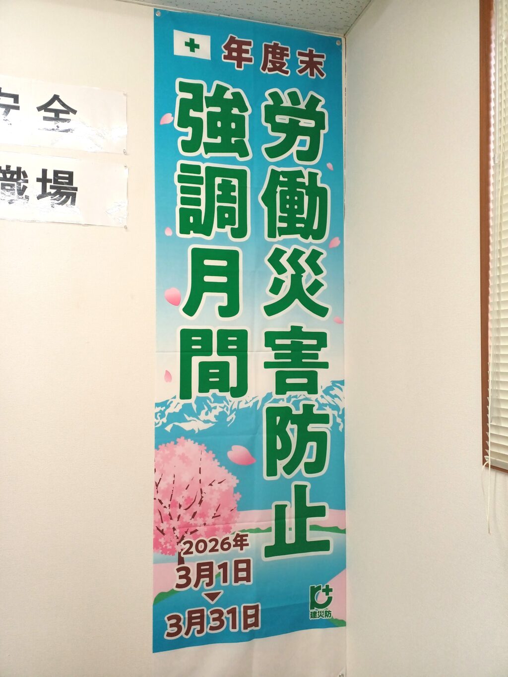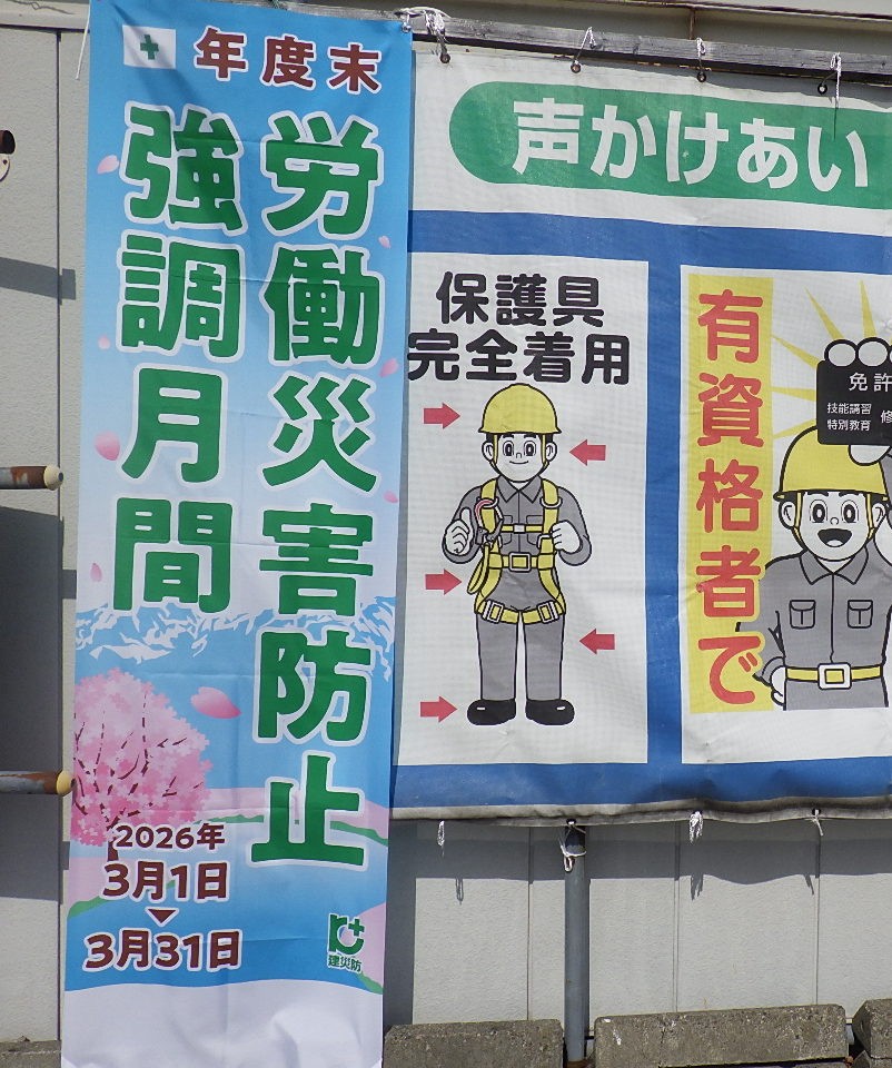 建設業では、3月は公共工事を含め多くの工事が竣工時期を迎え繁忙度が増すことから、労働災害防止を図る上で特別な配慮が求められる時期であります。北陸パブリックメンテナンス株式会社では日頃からの安全衛生教育に加え、のぼり旗やポスターなどを掲示して労働災害防止活動を積極的に展開しております。